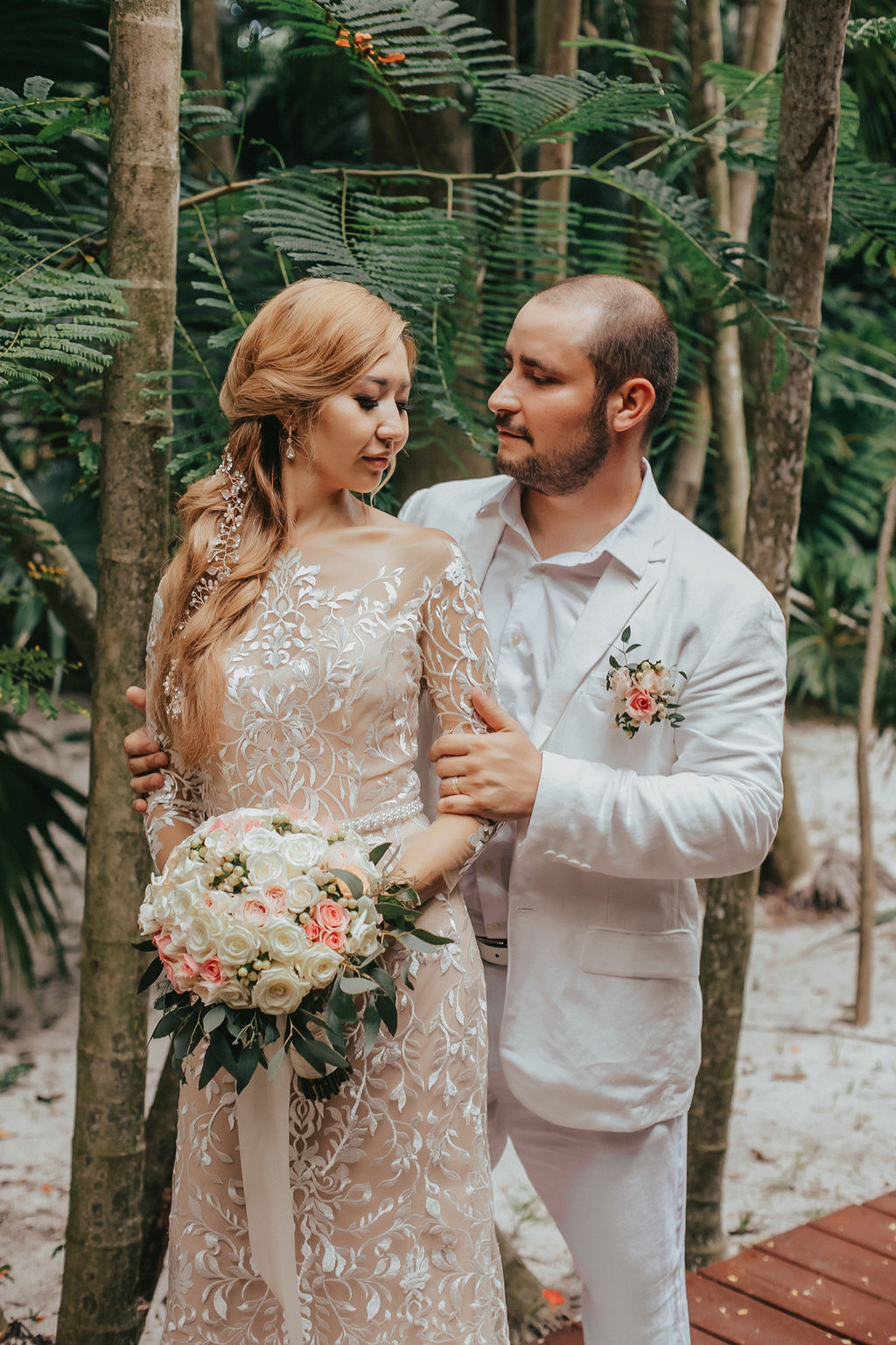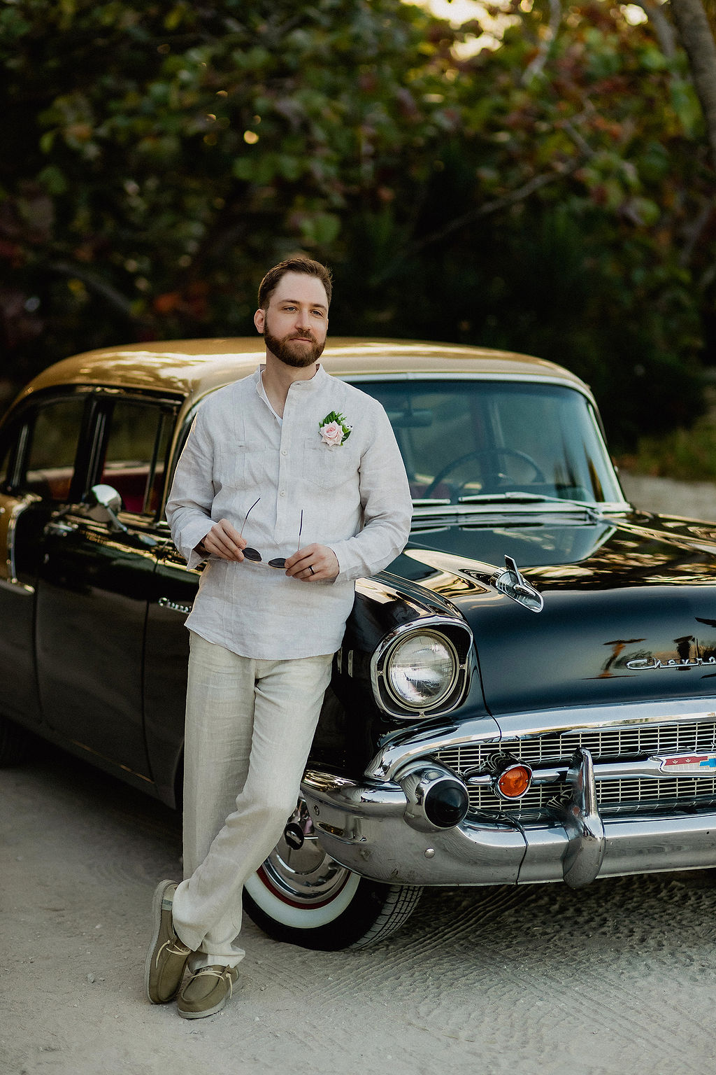 For partners in suits: light linen is the way to go. Cream, light gray, or soft blue looks incredible against sand and water. Skip the tie — an open collar with a linen suit reads effortless and intentional. Hem your pants above the ankle. Wet hems in photos look accidental, not romantic.