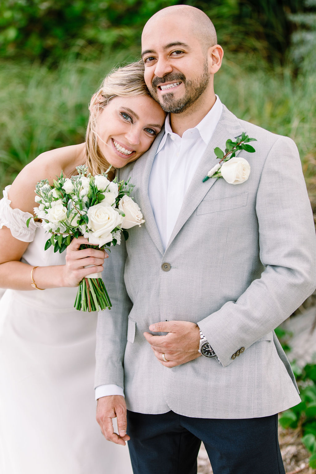 Skip the veil — wind will fight you the entire time. Half your photos will feature a wall of tulle across your face. A flower crown, a simple hair comb, or a jeweled clip gives you that bridal moment without the battle. If a veil is deeply important to you, go short — birdcage or shoulder-length maximum.